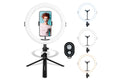 The Agfaphoto 11" Bluetooth LED Desktop Ring Light for Smartphones is an 11" (28 cm) ring light that will provide the perfect lighting for your photo/video shooting sessions, your videoconferences and even your make-up sessions. The 120 LEDs integrated into the ring light give off powerful and uniform lighting. The brightness can be adjusted via a remote control. 3 colour modes are also available (cold, natural and warm) so you can choose the one that suits you best. Its robust table tripod ensures perfect stability. It includes a smartphone holder and a Bluetooth remote control so you can start and stop your smartphone remotely.