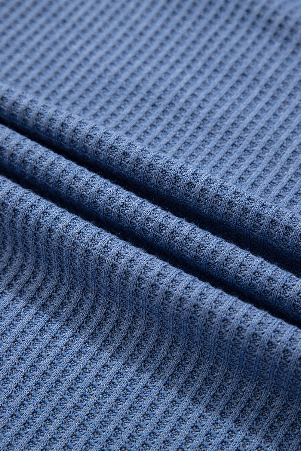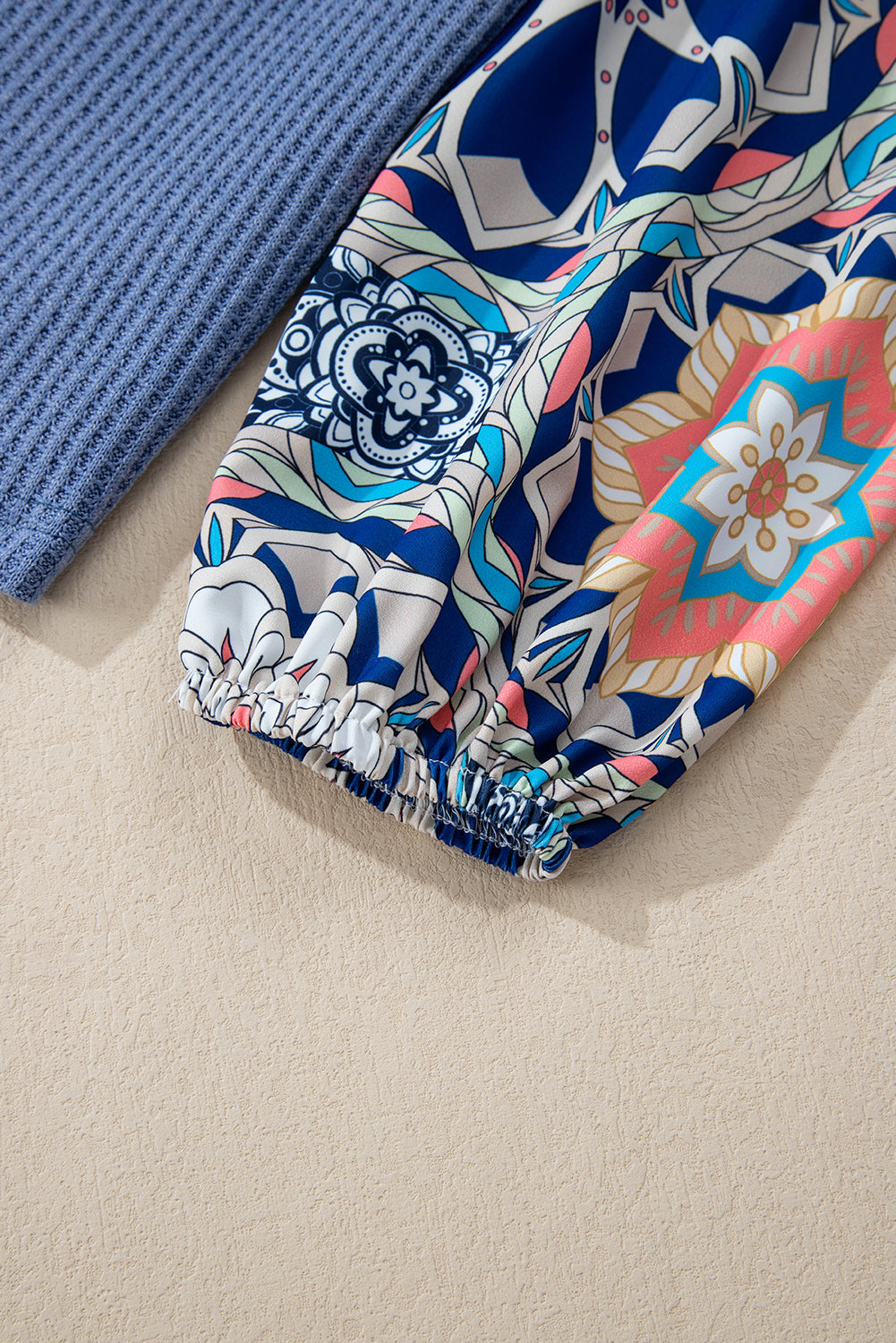 Blue O-Neck Waffle Knit Blouse with Floral Sleeves and Ruffles