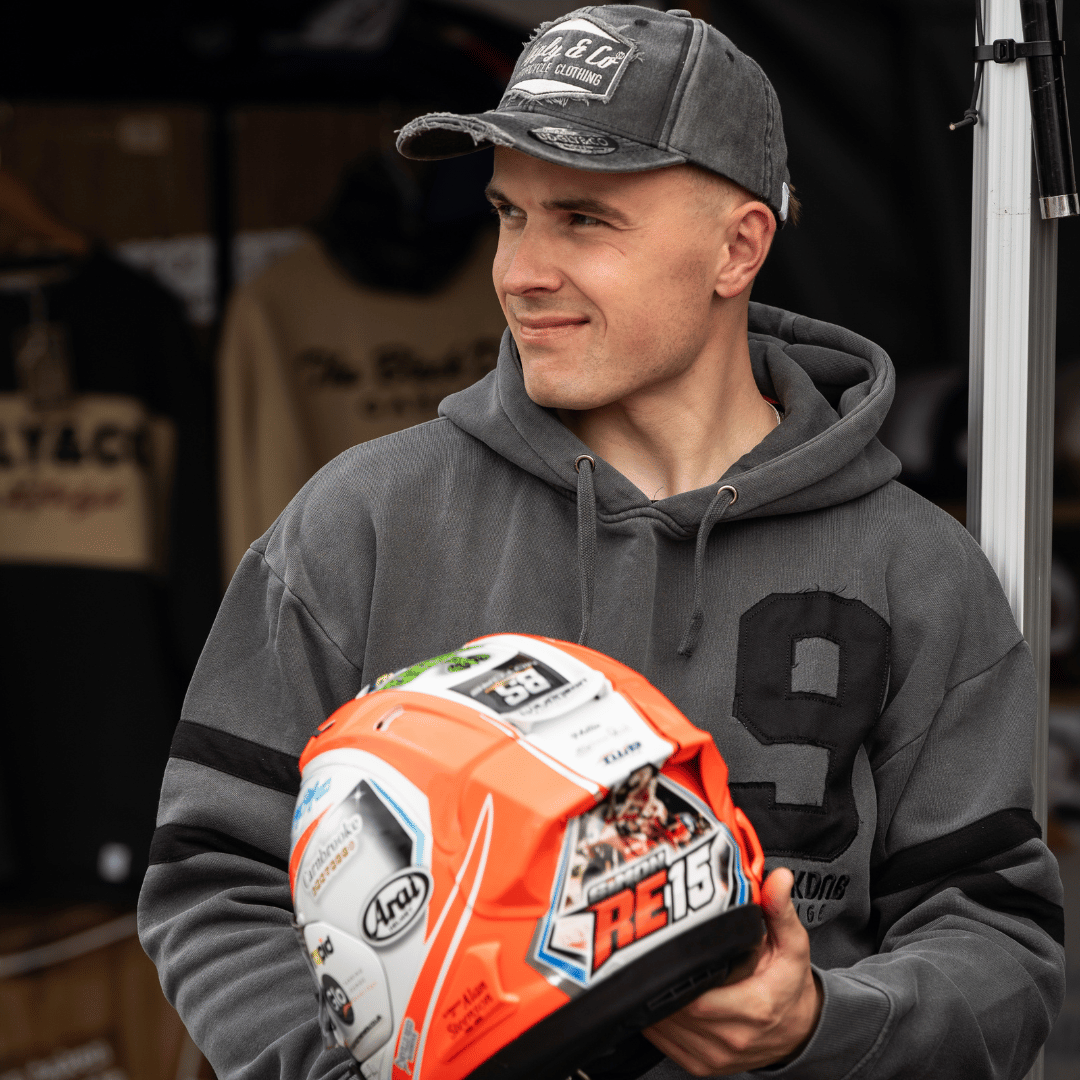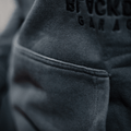 Introducing the collaborative masterpiece from Uggly&Co and The Black Dub, Mile 9: The Baseball-Inspired Hoodie. At its forefront, a weathered fabric baseball-style number 9 is skillfully sewn on, adorned with tassels and distressed edges, proudly showcasing the embroidered "Black Dub Garage" beneath.