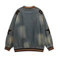 Design: Unique denim V-neck pullover with embroidered five-pointed star and lettering for a streetwear-inspired vibe
