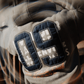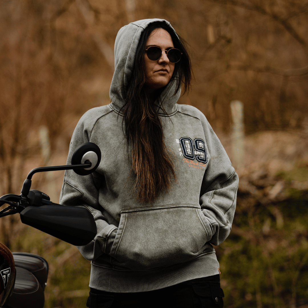 But what really sets this hoodie apart are the details. A spanner is subtly embroidered into the cuff of the sleeve — a nod to the tools that keep the machines running — with the head sized at 9mm to honour the 9th milestone. The hoodie itself is built on a vintage raglan silhouette, with sleeves that run all the way to the neckline — no shoulder panels, just pure old-school shape. Elbow paneling adds a hit of vintage workwear structure, while contrast-colour seams run throughout, giving it an intentionally unfinished, garage-built vibe.