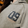 The hoodie starts with a deep green base that’s been acid washed over several days, giving each piece a unique, road-worn patina straight out the gate. No two are exactly alike — and that’s the point.