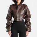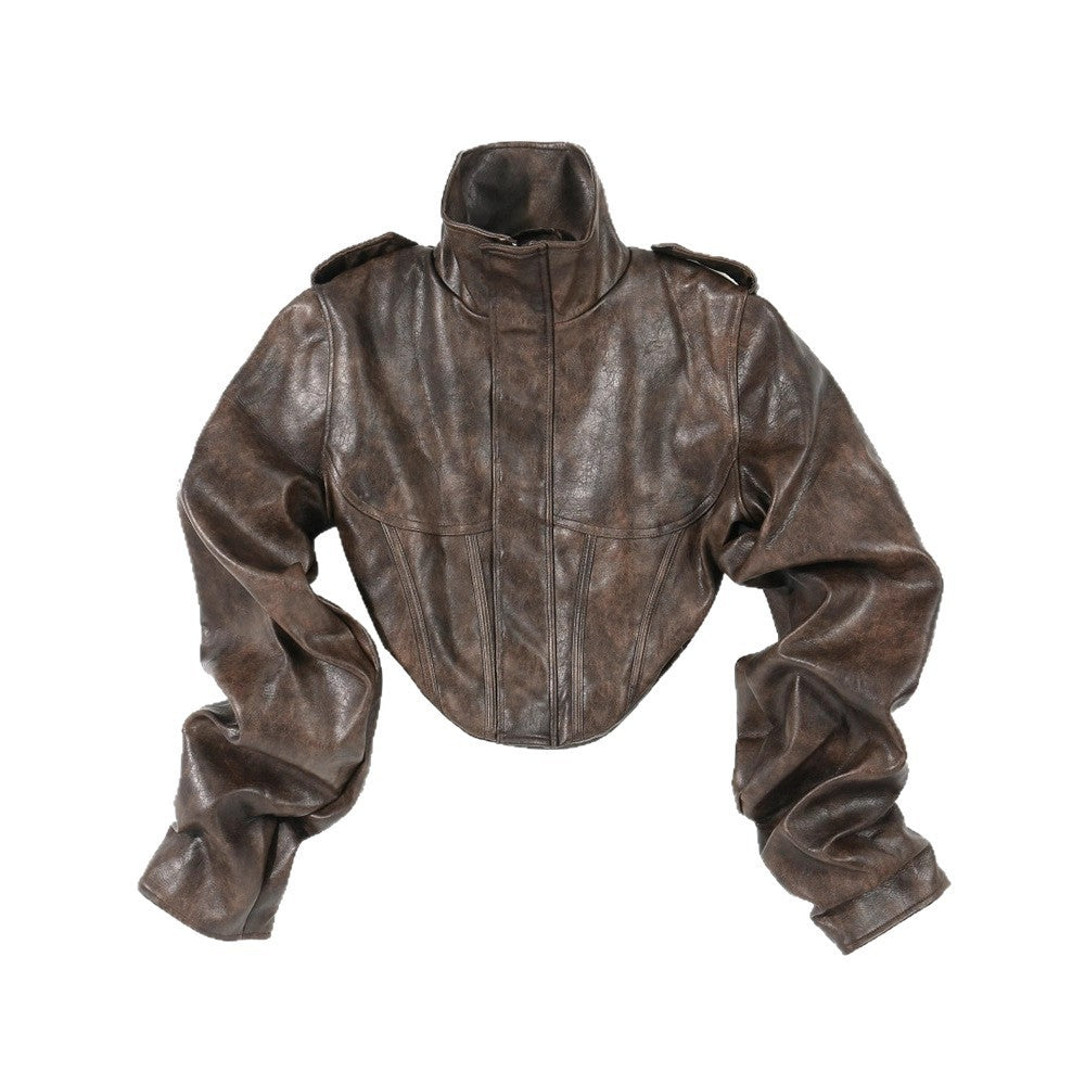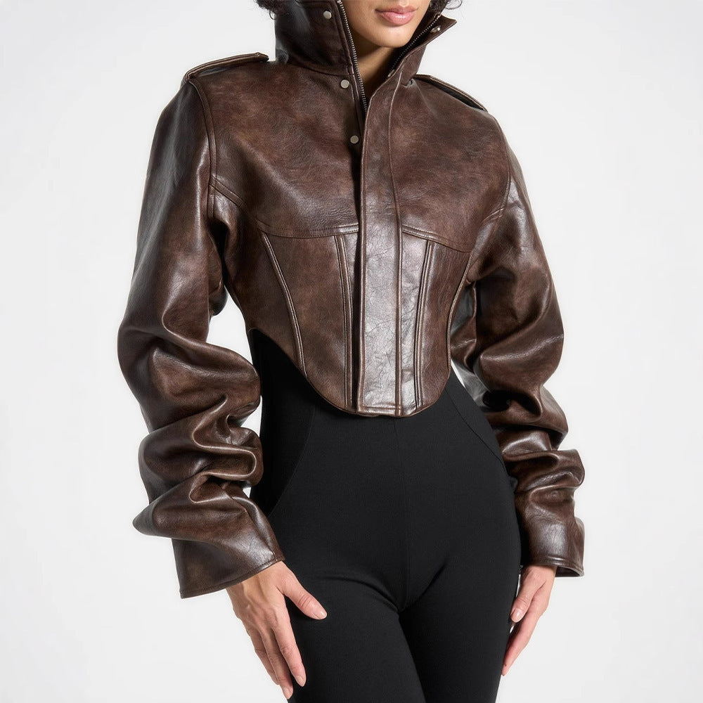 Design: Short fitted PU leather coat featuring a fishbone cut that defines the waist for a flattering, sculpted look