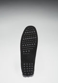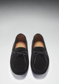 Black suede driving loafers with a tan coloured soft leather lining and rubber studded driving shoe sole.