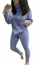 This Ladies Chunky Knitted Ribbed Polo High Neck Top Leggings Loungewear Suit Set is a stylish and cozy outfit made of high quality materials. The ribbed top features a high neck and long sleeves, while the matching leggings offer a comfortable fit. Perfect for lounging at home or running errands.