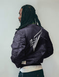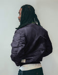 The classic MA-1 bomber jacket in navy, originally designed for the U.S. Air Force and sourced and up-cycled from vintage military dead stock. Features cotton with knit hem and cuffs, side entry flap pockets and zipper sleeve pocket. This style is a reversible design with a bright orange lining with interior pockets, originally intended for emergency visibility.
