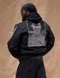 The classic MA-1 bomber jacket in black, originally designed for the U.S. Air Force and sourced and up-cycled from vintage military dead stock. Features signature ST custom screen printed patches of some of Stuart’s favourite decals and our favourite Rock n Roll icon mugshot on the back. This style is a reversible design with a bright orange lining with interior pockets, originally intended for emergency visibility.