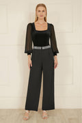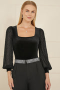 Mela Black Velvet Bodysuit With Sheer Sleeves And Square Neckline