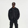 Men's Black Washed Denim Jacket with Zipper and Pocket Detailing - Retro Streetwear Style