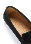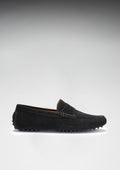 Black suede men's driving loafers featuring luxurious dark tan calf leather lining.