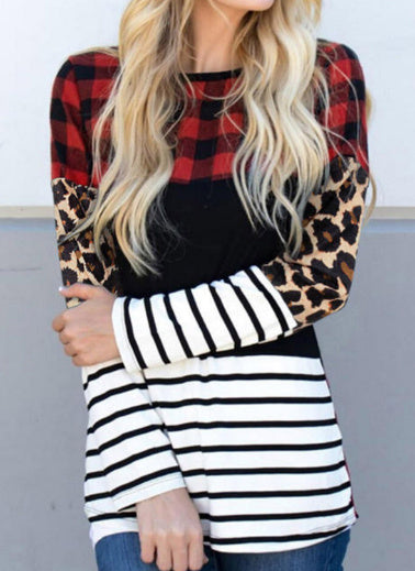 Plaid Print Leopard Blouse, Striped Colour Block Long Sleeve Top