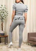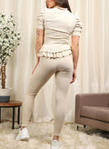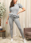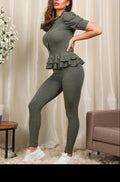 Short Sleeves Two Piece Suit with Ribbed Legging Co-Ord Top Gold Button Frill Hem Peplum Ribbed Lounge Set