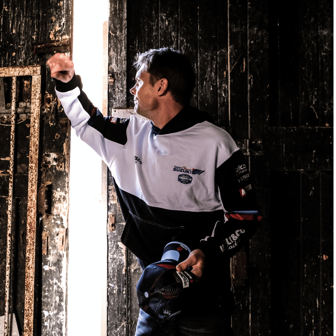 Signature Suzuki red and blue detailing runs along the sleeves, with dynamic accents that echo the team’s rich racing heritage. Every element of this hoodie embodies the bold, high-energy spirit of Team Classic Suzuki.