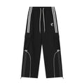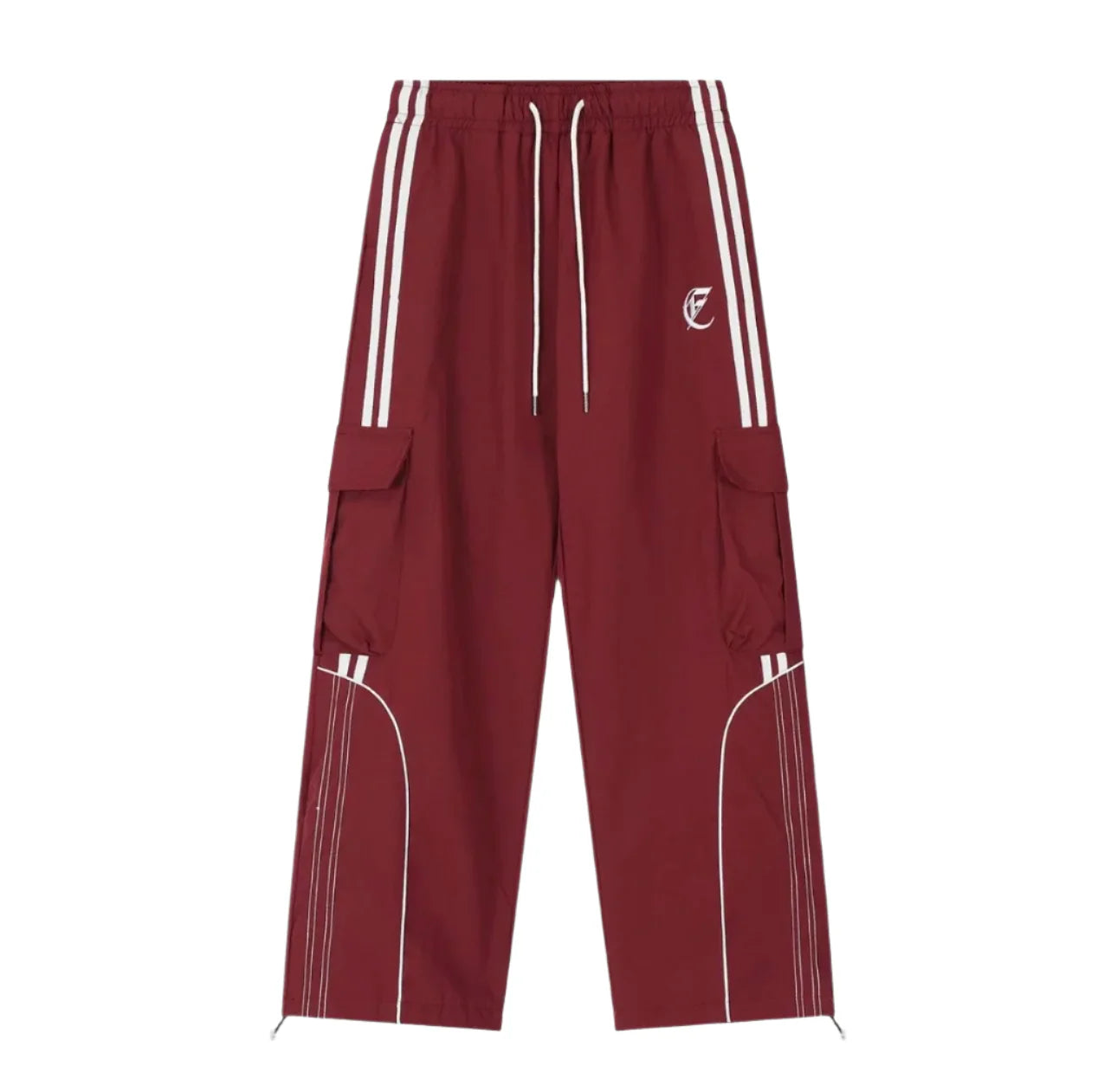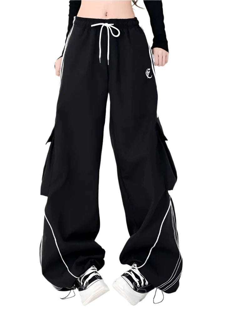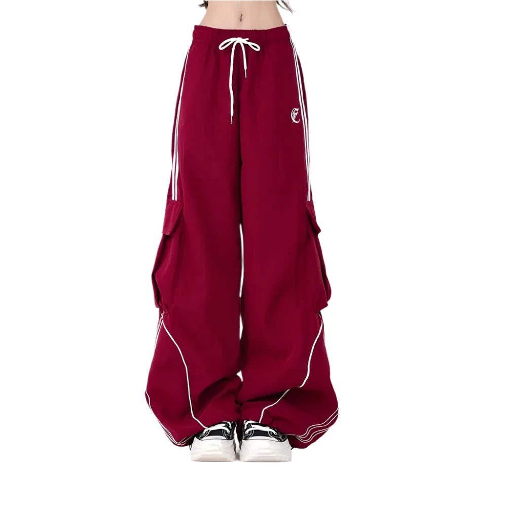 Vaultline '24 cargo pants for women offer a high waist and loose fit with fun stripes. Made from broadcloth, they feature flat fronts, ankle-length legs, and a drawstring closure for easy wear. Perfect for a relaxed, playful look!