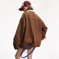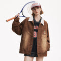 Features: Loose fit, straight hem, contrast color lapels, washed and worn design, long regular sleeves, ordinary thickness