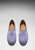 Hugs & Co. lilac espadrille shoes for women. Continental espadrille style shoes in lilac suede upper. The unique sustainable sole designed by Hugs & Co. features upcycled car tyre and natural cork with EVA mix midsole. Each pair is made with carefully selected soft Italian suede with a luxurious tan leather lining for comfort.