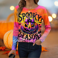 Available in multiple festive patterns—Spooky Season, Pumpkin Lanterns, Witch Flight, and more—this Halloween-themed women’s top is a must-have for fans of holiday fashion. Embrace the magic of fall with this comfortable, durable, and trendy sweatshirt that combines seasonal spirit with everyday practicality.
