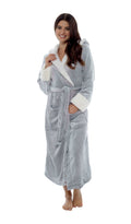 Women's Luxurious Shimmer Grey Fleece Dressing Gown With Sherpa Fur Hood Plush Flannel Bath Robe Elegant Silver Soft Cozy Loungewear by Daisy Dreamer