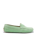 Hugs & Co. lagoon green penny loafer driving shoes for women. Moccasin style driving loafers made with luxurious lagoon green suede upper and lined with a soft leather for extra comfort.