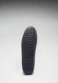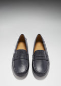 Hugs & Co. navy blue penny loafer driving shoes for women. Moccasin style driving loafers made with luxurious navy blue leather upper and lined with a soft leather for extra comfort.