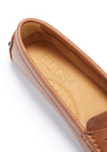Hugs & Co. tan leather penny loafer driving shoes for women. Moccasin style driving loafers in luxurious tan outer and lined with a soft leather for extra comfort.