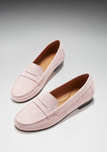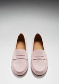 Hugs & Co. ice pink penny loafers for women. Moccasin style loafers in a soft ice pink leather outer and lined with light tan leather for extra comfort. The light weight leather sole achieves a low profile silhouette for this style.