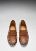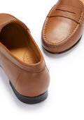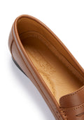 Hugs & Co. tan penny loafers for women. Moccasin style loafers in a soft tan leather outer and lined with light tan leather for extra comfort. The light weight leather sole achieves a low profile silhouette for this style.