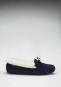 The most comfortable sheepskin slippers by Hugs & Co. made in an elegant moccasin style with a full fluffy natural sheepskin lining. Soft navy blue Italian suede is sewn together by hand to form these luxury house shoes and a full natural rubber sole is applied for a level of grip around the house. Each pair has a laced bow detail on the front.