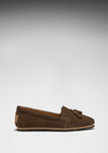 Hugs & Co. brown espadrille shoes for women. Tasselled espadrille style shoes in brown suede upper. The unique sustainable sole designed by Hugs & Co. features upcycled car tyre and natural cork with EVA mix midsole. Each pair is made with carefully selected soft Italian suede with a luxurious tan leather lining for comfort.