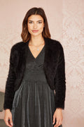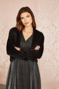Layer up with the Yumi Black Eyelash Knit Bolero. Perfect to finish off an evening outfit to keep the chill off, or style with jeans and roll neck for an easy day to day look. The eyelash knit feels incredibly soft, and adds a fun twist to this classic style. Size reference, Small 8-10, Medium 10-12, Large 12-14.