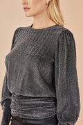 The perfect top for any invite this party season. Designed for a comfortable and flattering fit, the long sleeve is paired with ruching on the hemline, all crafted from a shimmering metallic stretch fabric. Pair with a leather skirt or jeans and boots.