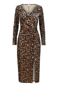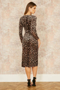 Yumi Brown Velvet Leopard Print Fitted Midi Dress