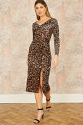 With party season in full swing, why not go for a little leopard print to stay bang on trend. This fitted velvet midi dress with long sleeves and split hemline looks great for any invite, Style with some heels for evening invites and a fur coat to complete the full on glam look.