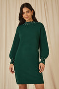 Yumi Green Pearl Detail Knitted Relaxed Jumper Dress
