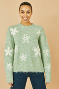 Yumi Green Relaxed Knitted Jumper With Crochet Flowers