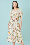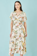 This dress features a rich Ivory base adorned with a vibrant, painterly floral print, crafted from soft, breathable viscose for a beautifully fluid feel. The wrap-style bodice creates a flattering V-neckline, complemented by fluttery short sleeves that add effortless movement. A gently cinched waist flows into a sweeping A-line skirt, delivering an elegant, feminine silhouette perfect for both daytime outings and elevated evenings.