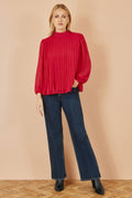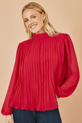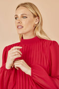 Yumi Red Pleated Long Sleeve Top With High Neck