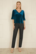 Yumi Teal Velvet Relaxed Fit Top With Fluted Sleeves